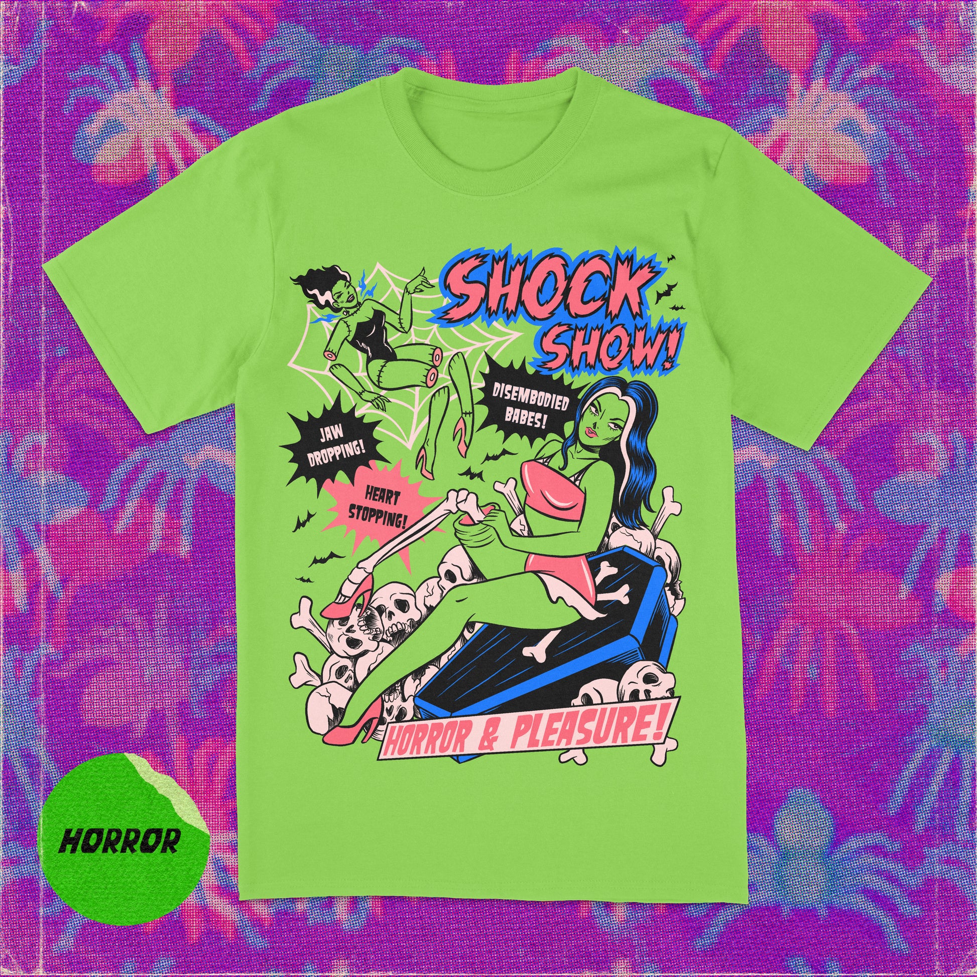Welcome to the Spooky Ghoul SHOCK SHOW! The New Ghoulish Shock Show Tee is a jaw dropping, heart stopping edition to your Halloween wardrobe collection.